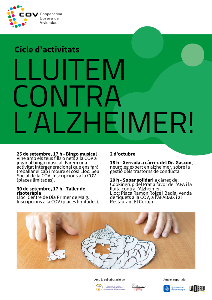 I el 2 d’octubre tanquem la programació amb dues propostes molt especials. A les 18 h, el Dr. Gascon, neuròleg expert en Alzheimer, oferirà una xerrada sobre com gestionar els trastorns de conducta. I a les 20 h, celebrarem un sopar solidari a la Plaça Ramon Roigé i Badia, preparat pel Cookingrup del Prat, a benefici de l’AFA i la lluita contra l’Alzheimer. Els tiquets es poden comprar a la COV, a l’AFABAIX i al restaurant El Cortijo.
