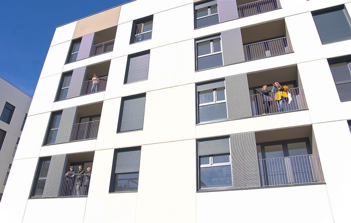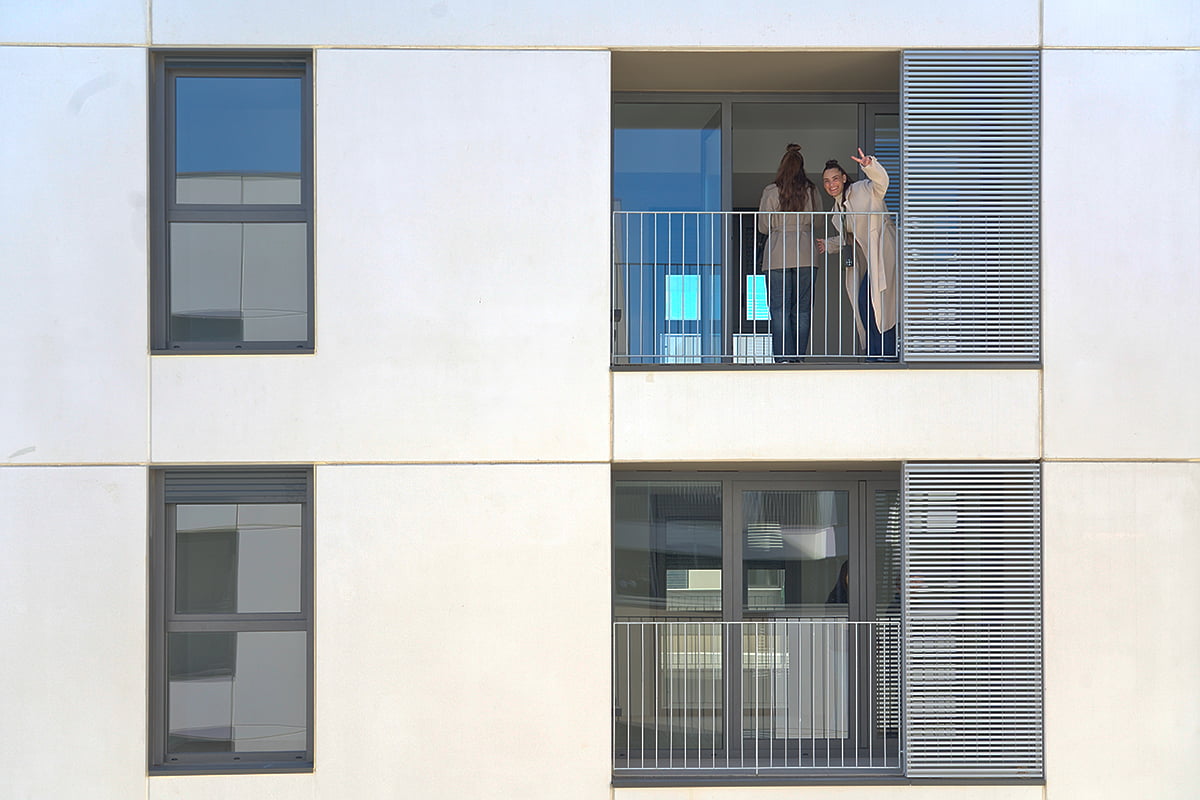 Es proposen terrasses amb àmplies superfícies que s’entenen com a extensions cap a l’exterior dels espais interiors dels habitatges i es reserva un espai de 3,5 m per habitatge a la coberta de l’edifici per a estendre-hi la roba. Les zones de la parcel·la no ocupades sobre rasant s’urbanitzaran donant continuïtat als materials i espais exteriors de l’entorn.